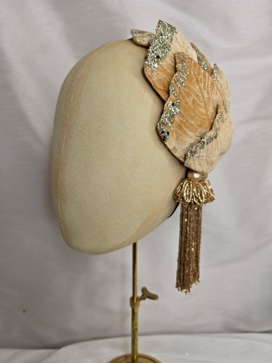 Champagne velvet glittered half hat/fascinator with gold beaded tassels (made to order)