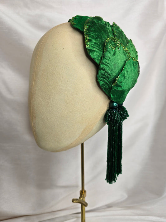 Emerald green velvet glittered half hat/fascinator with green beaded tassels (made to order)