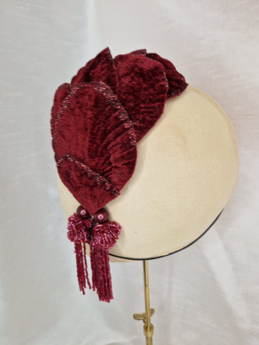 Burgundy velvet glittered half hat/fascinator with red beaded tassels (made to order)