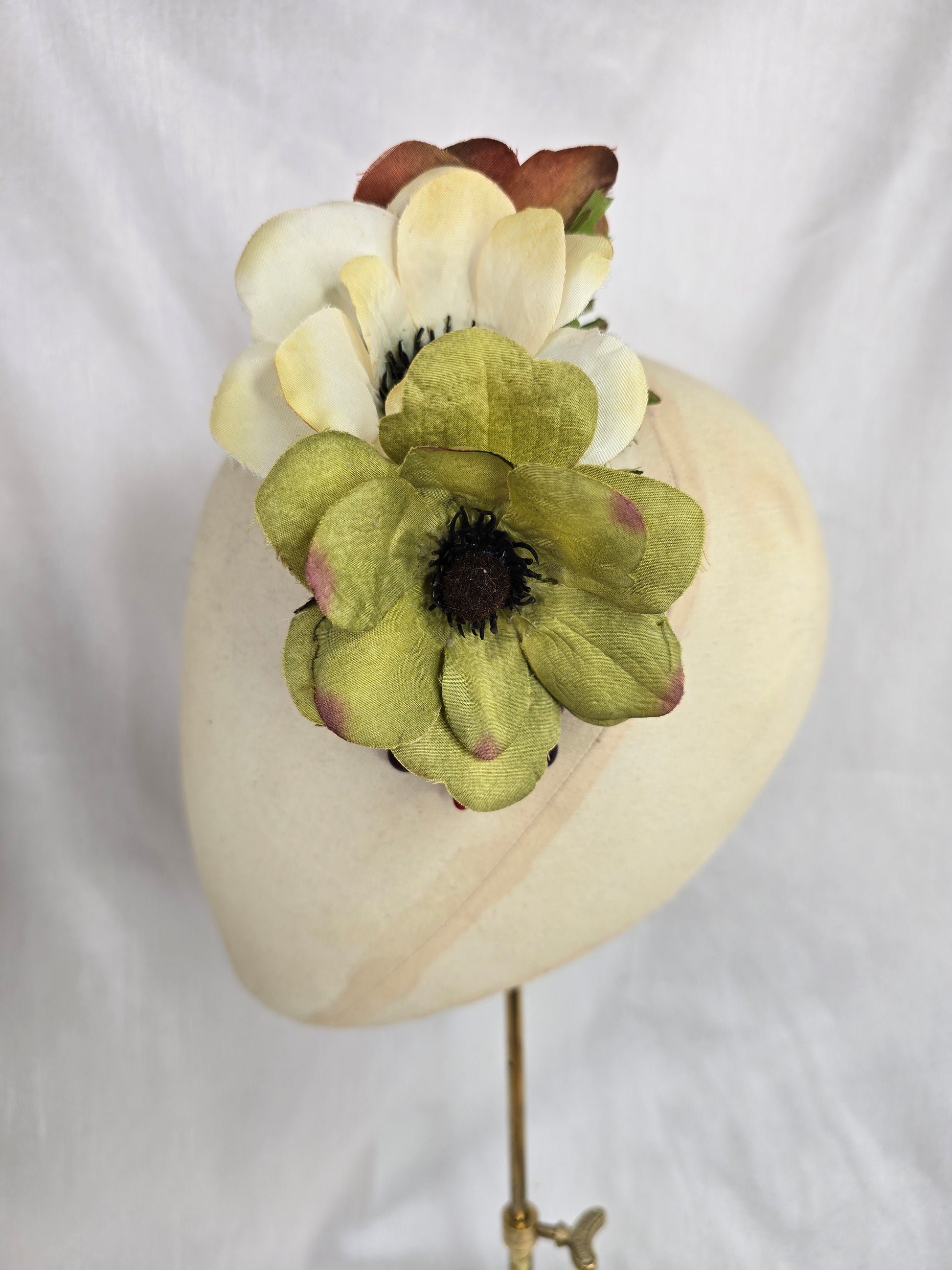 Triple anemone hair flower and corsage set in green, russet and cream with red berries and leaves.