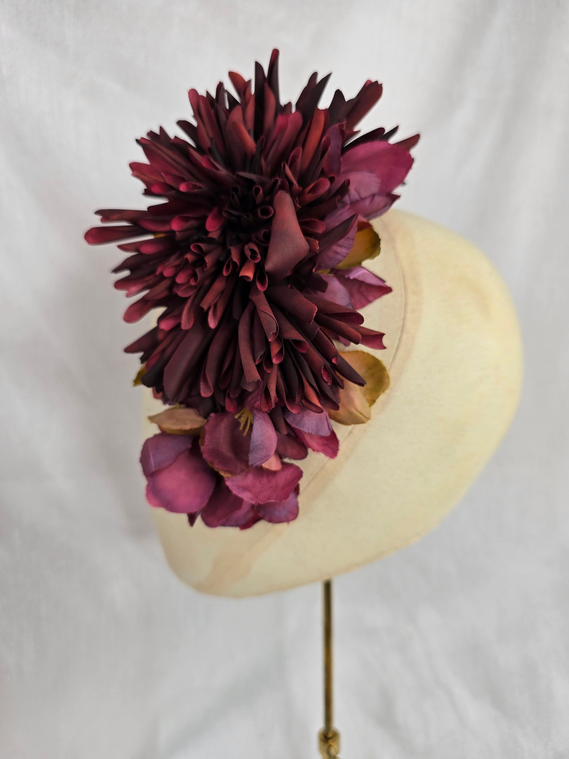 Autumnal hair flower and corsage set in maroon, berry and warm gold dahlia and blossoms russet with maroon berries and velvet leaves.