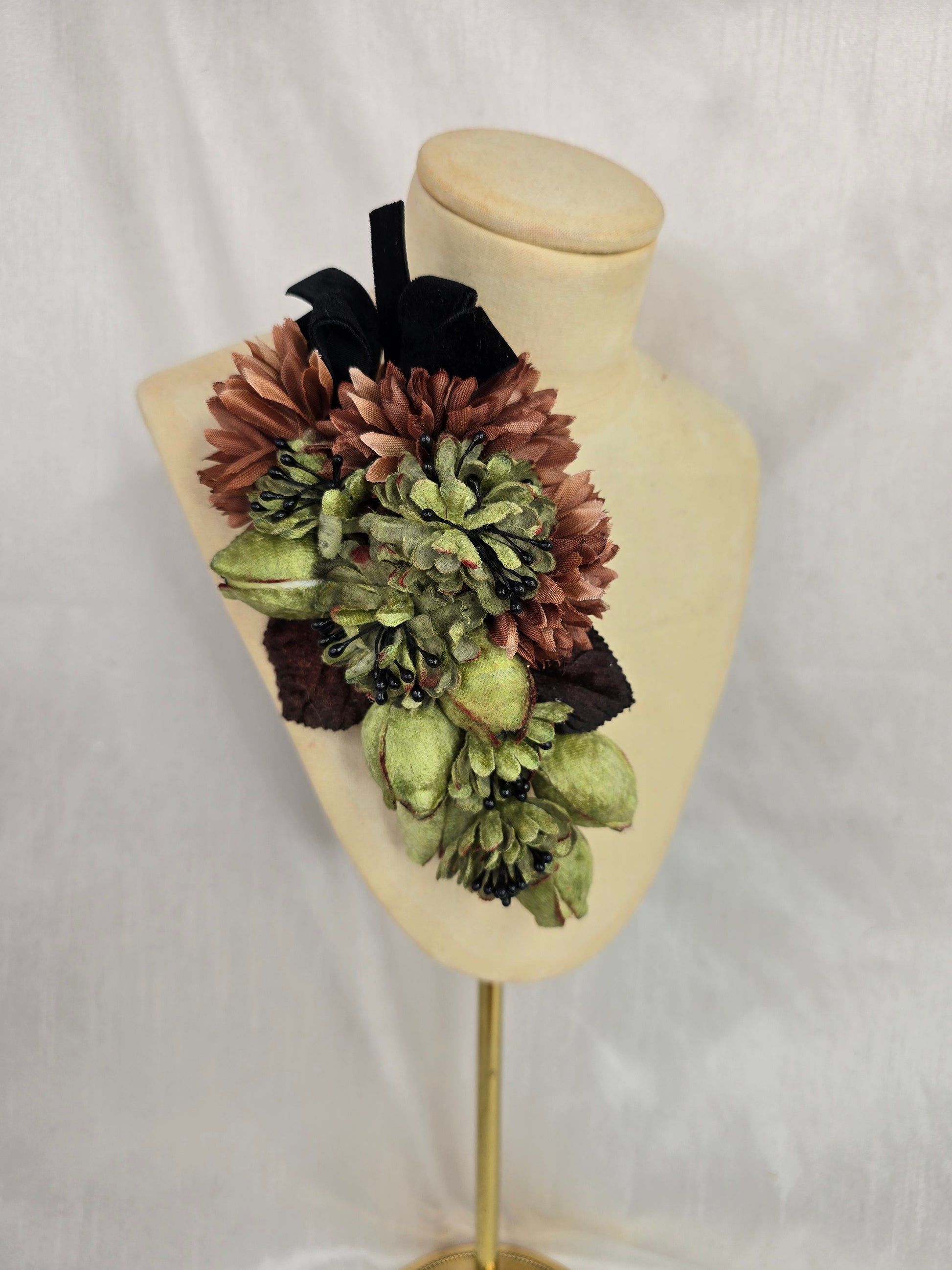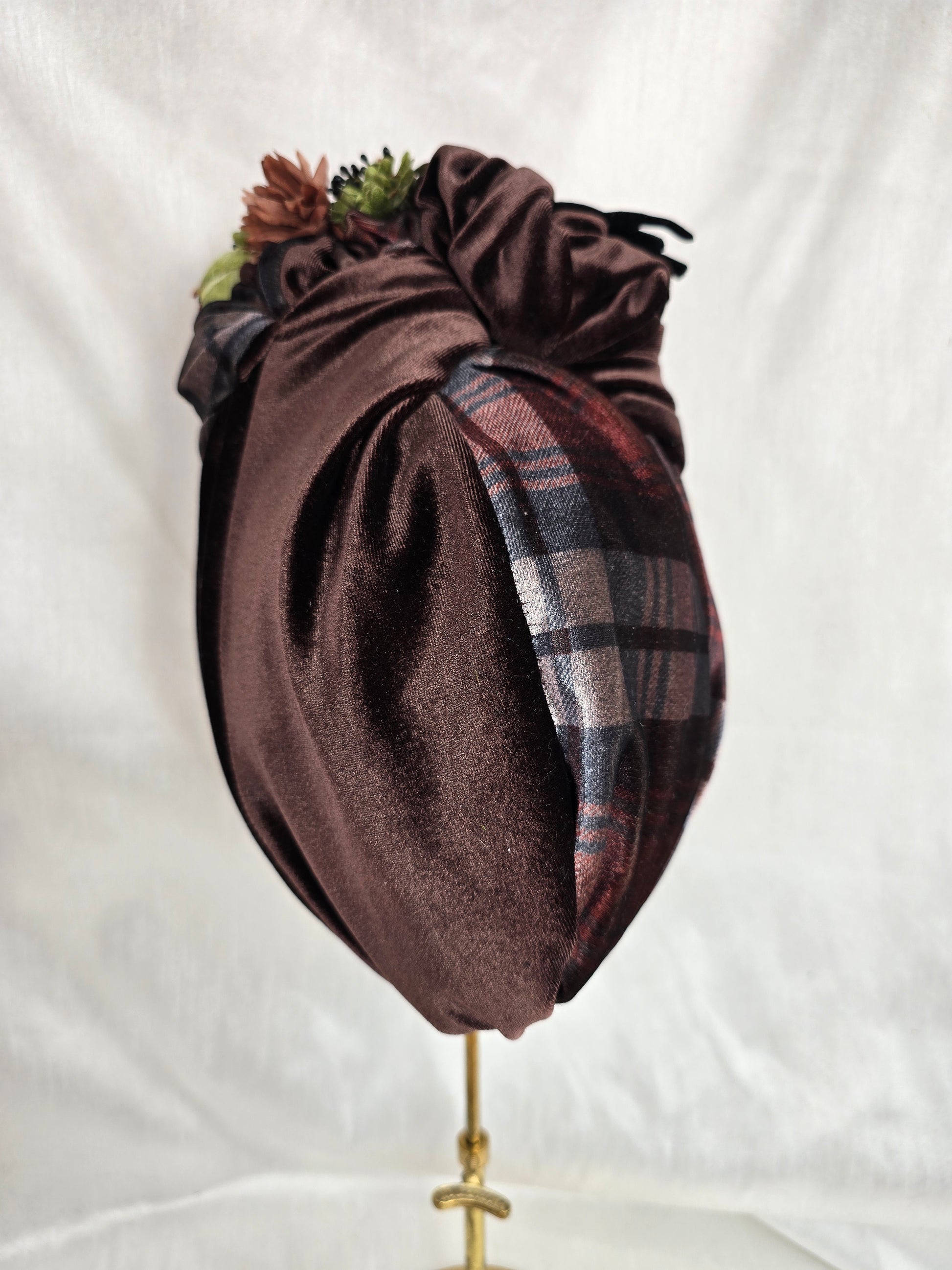 Brown check and chocolate brown colour block stretch velvet turban with coordinating corsage and flower trim. The flowers are created from handmade green and black blossoms, with matching buds and chestnut brown dahlias.