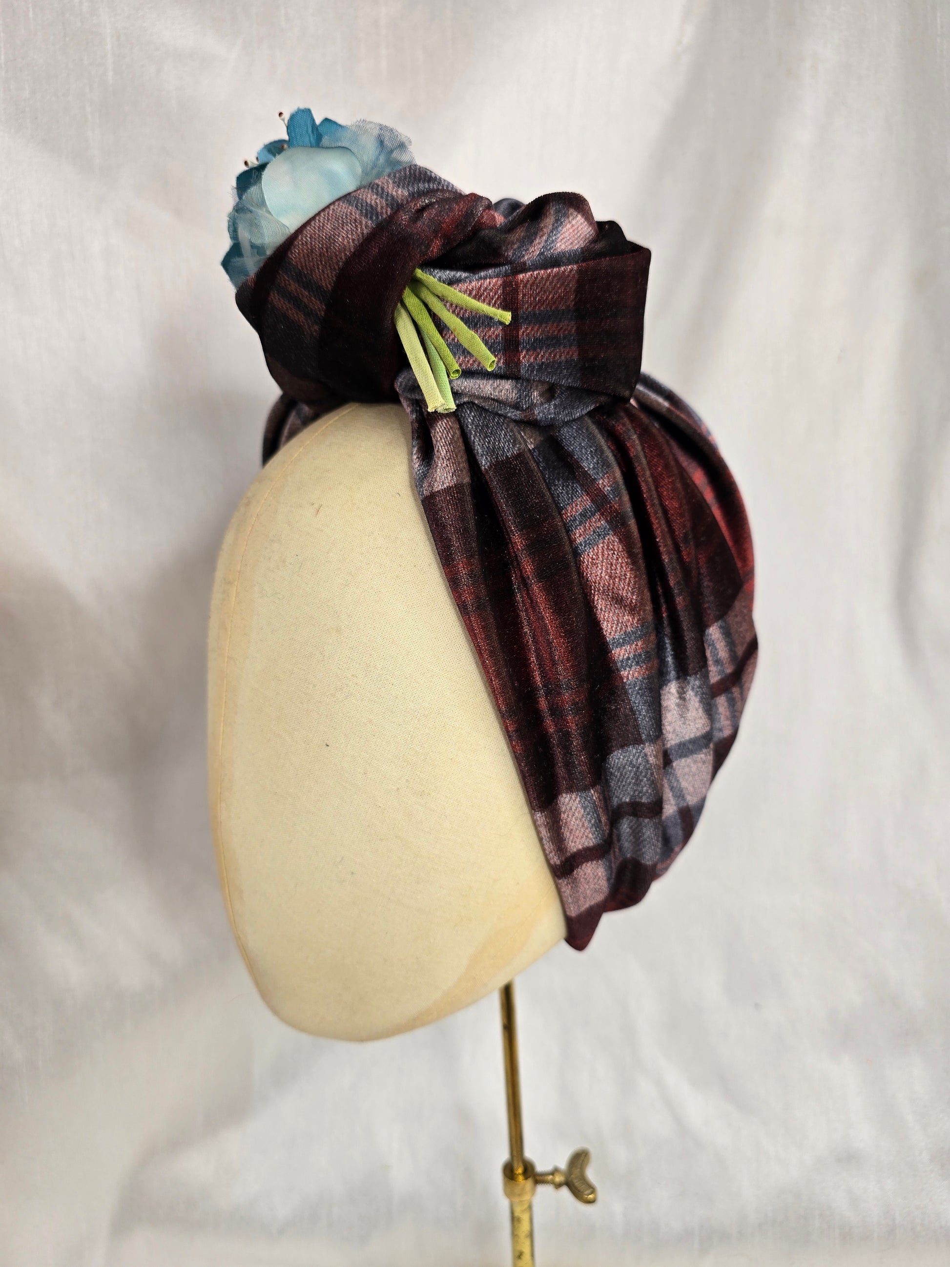 Brown check and stretch velvet turban with coordinating corsage and flower trim. The flowers are created from true vintage millinery flowers and stems