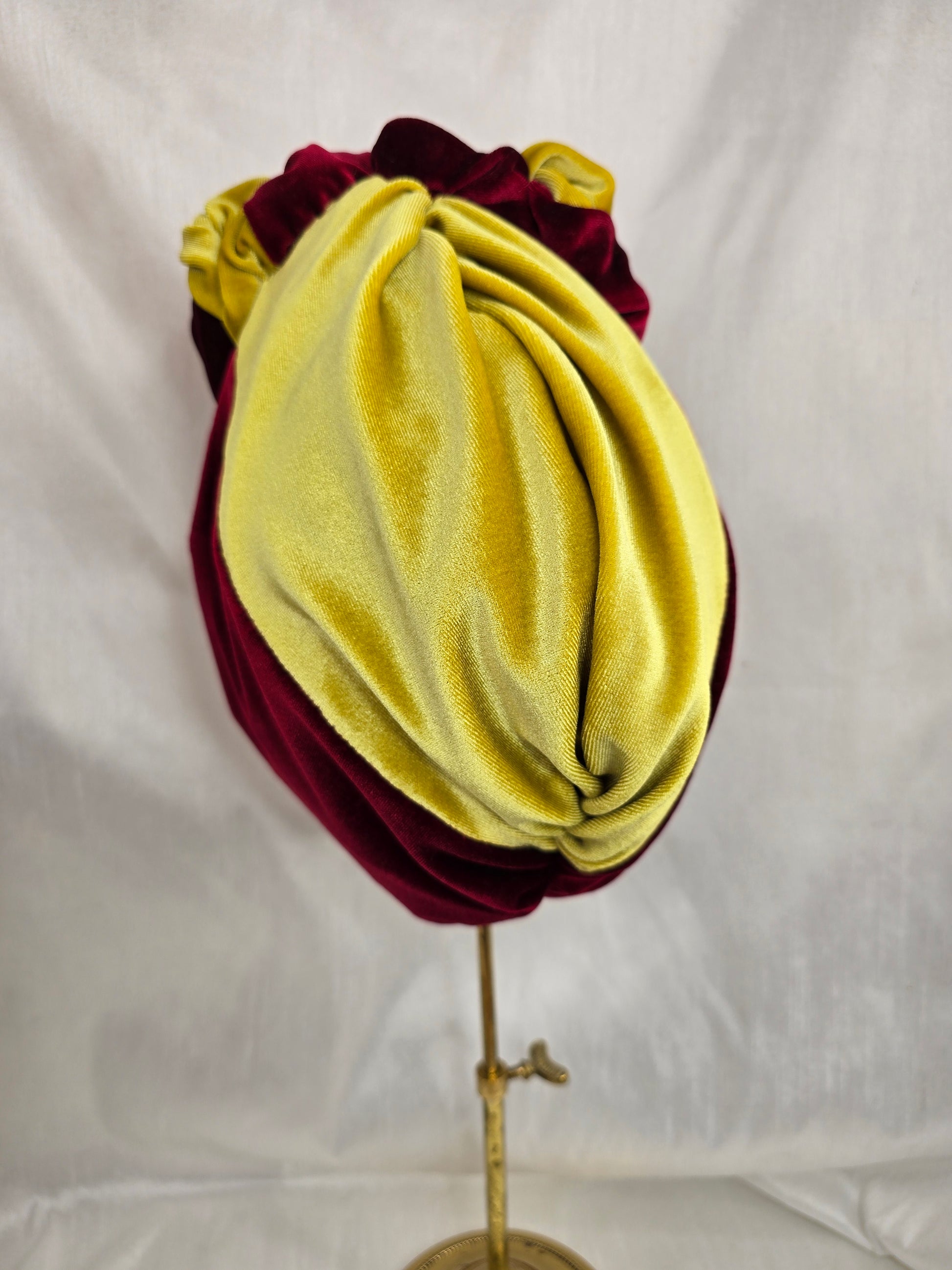(Copy) Black and chartreuse and red stretch velvet turban with flowers