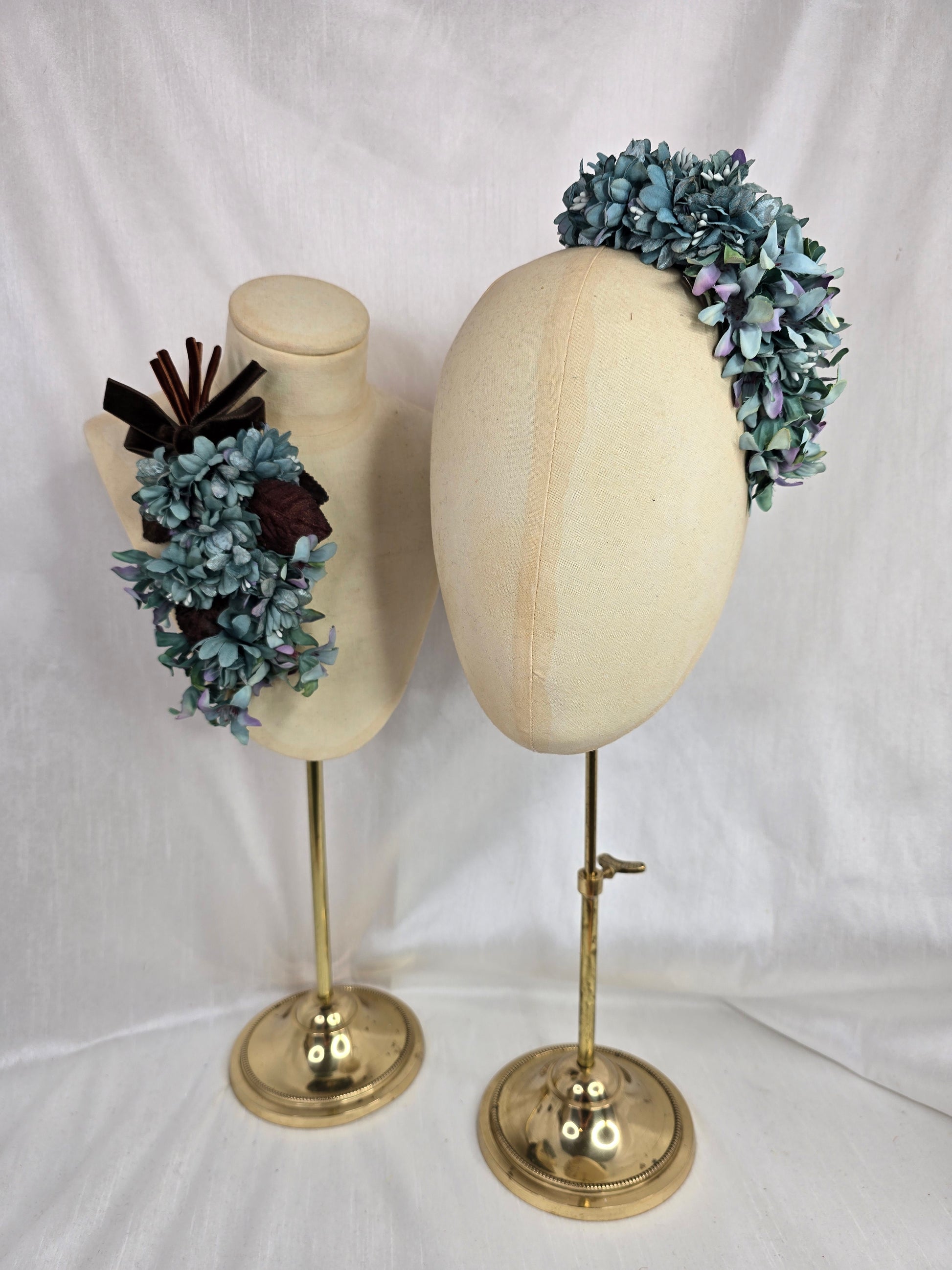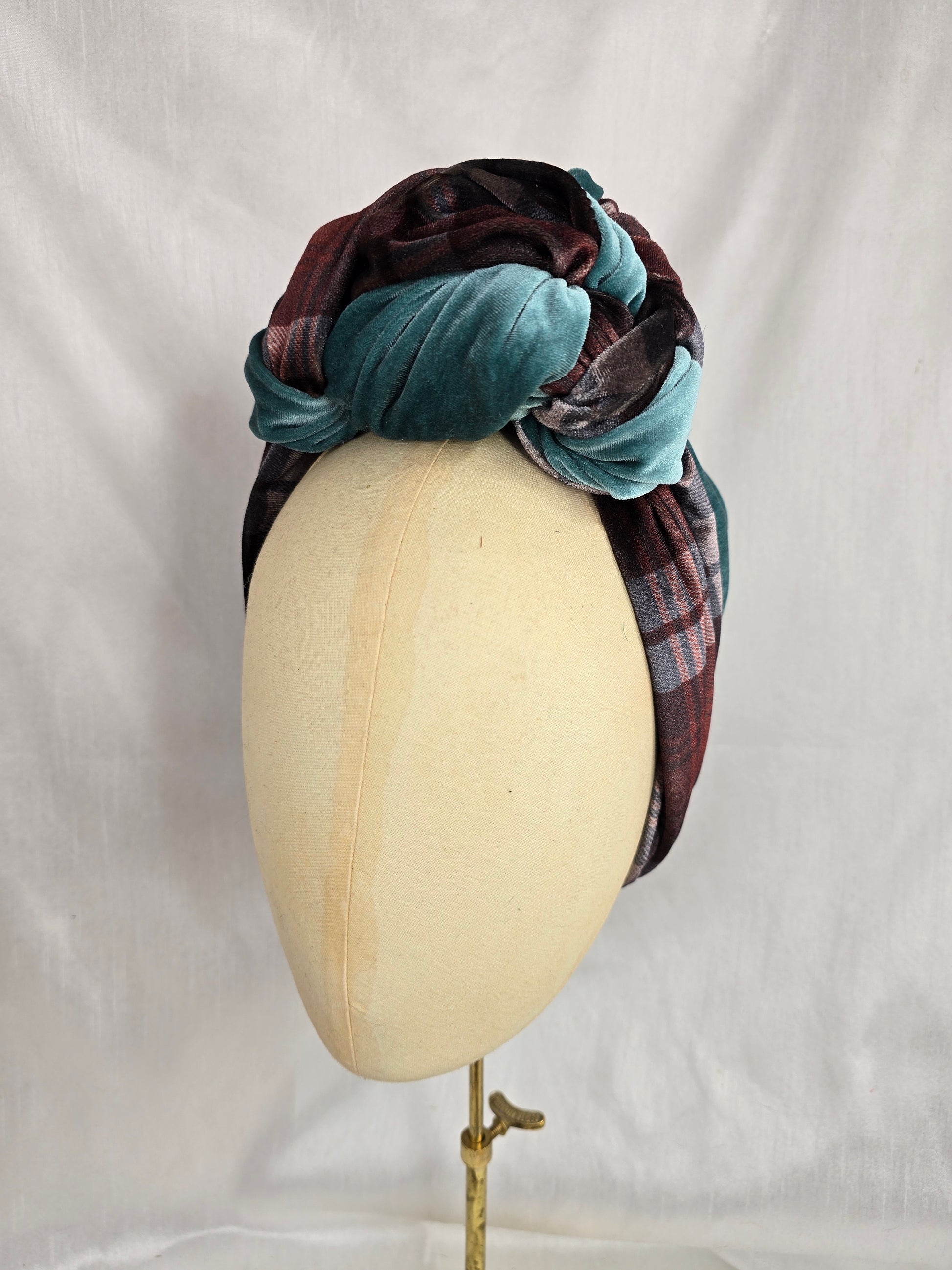 Brown check and duck egg blue stretch velvet turban with coordinating corsage and flower trim. The flowers are created from duck egg blue blossoms.