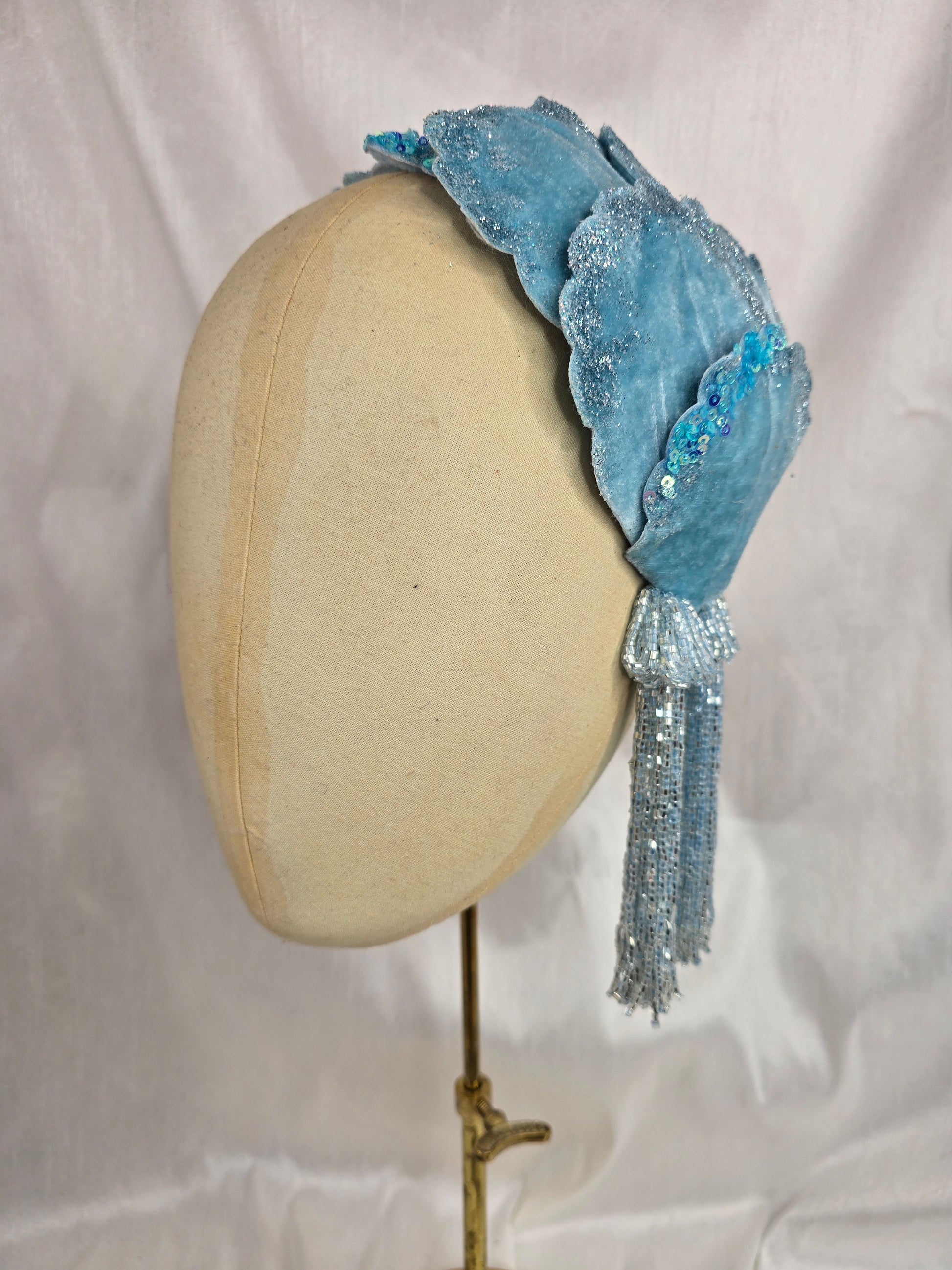 Beautiful Deco style pale aqua blue glittered half hat/fascinator. Adorned with 2 glamorous beaded tassels.