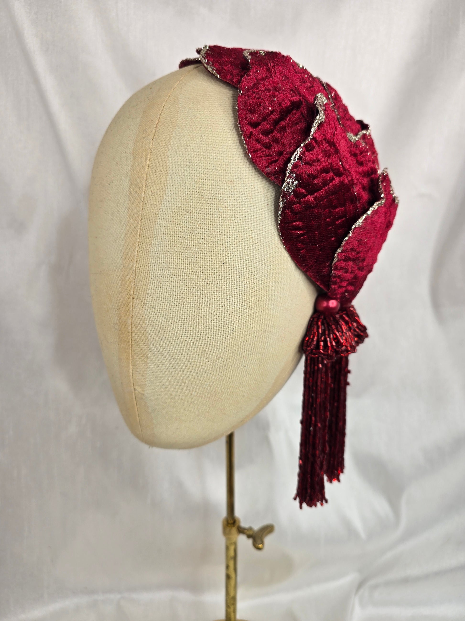 Beautiful Deco style wine red glittered half hat/fascinator. Adorned with 2 glamorous beaded tassels.