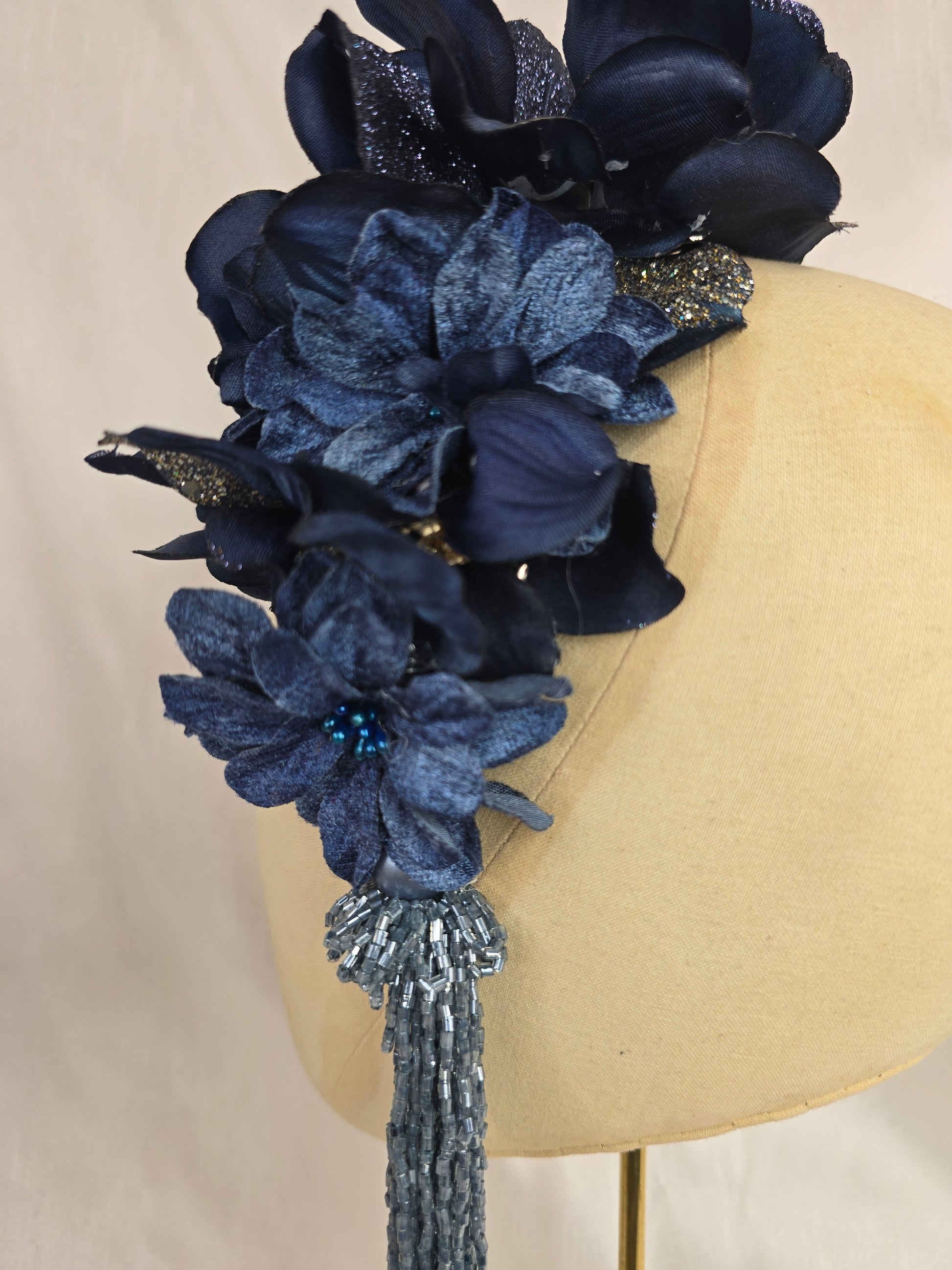 Large cascade hair flower of navy and silver glittered dogwood and velvet daisies with hand inserted stamens. Adding glamour is the beaded tassel in blue. Attaches into the hair with 2 metal alligator clips