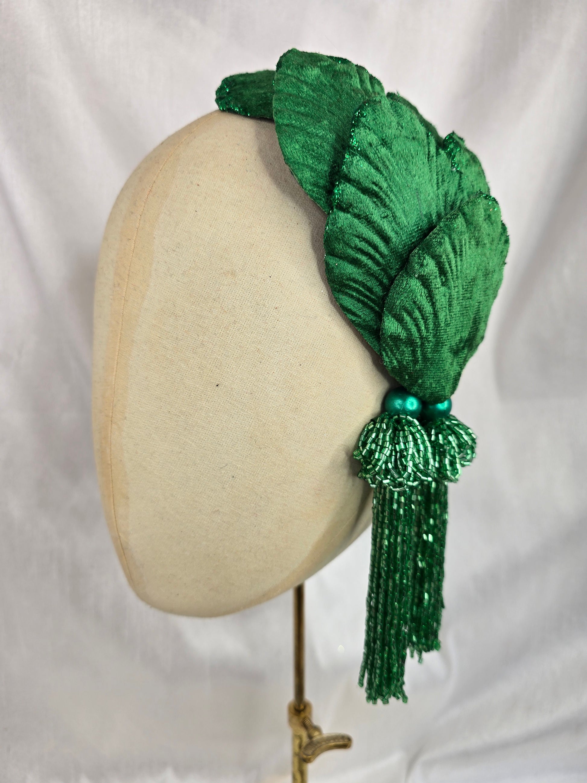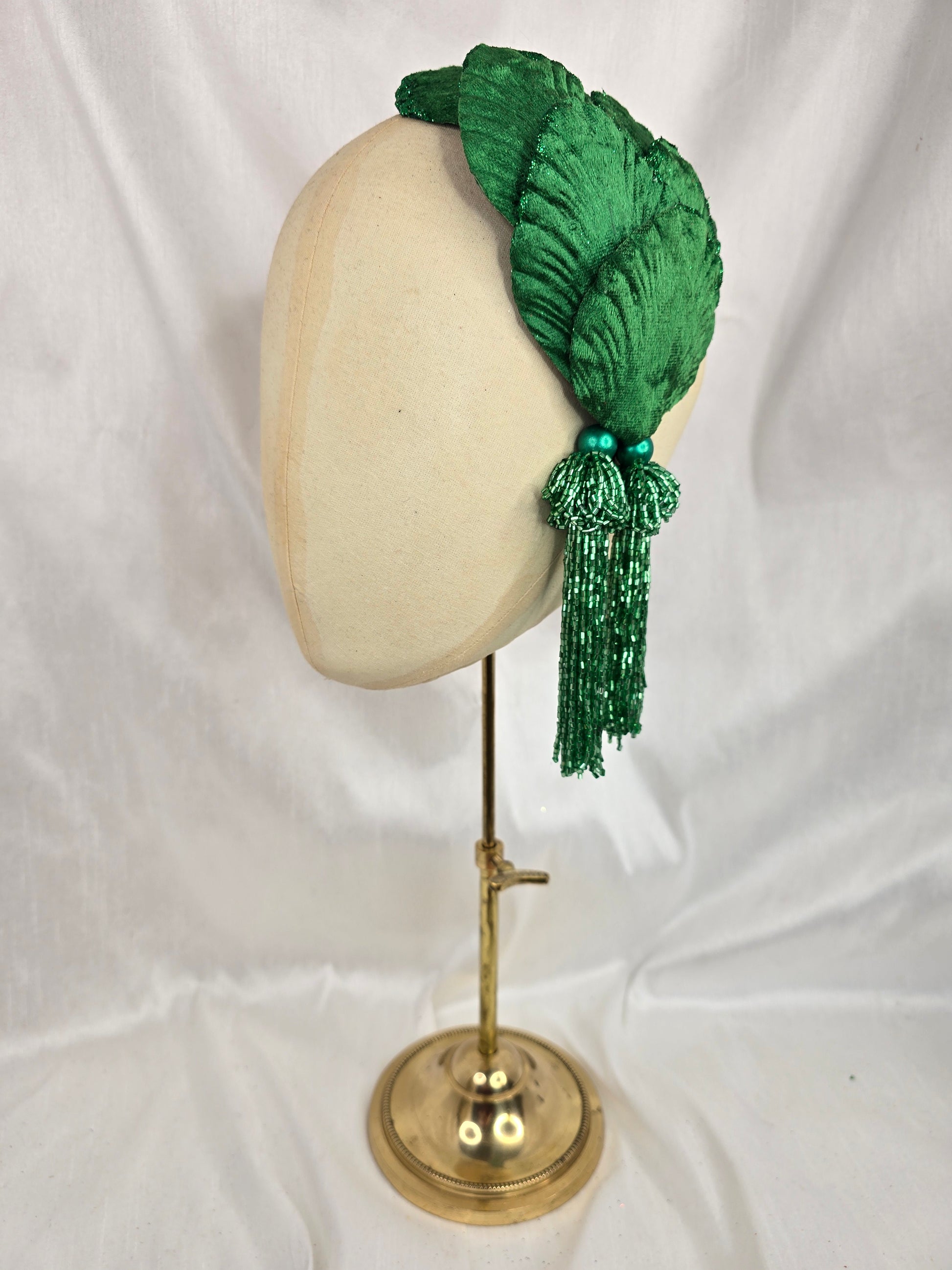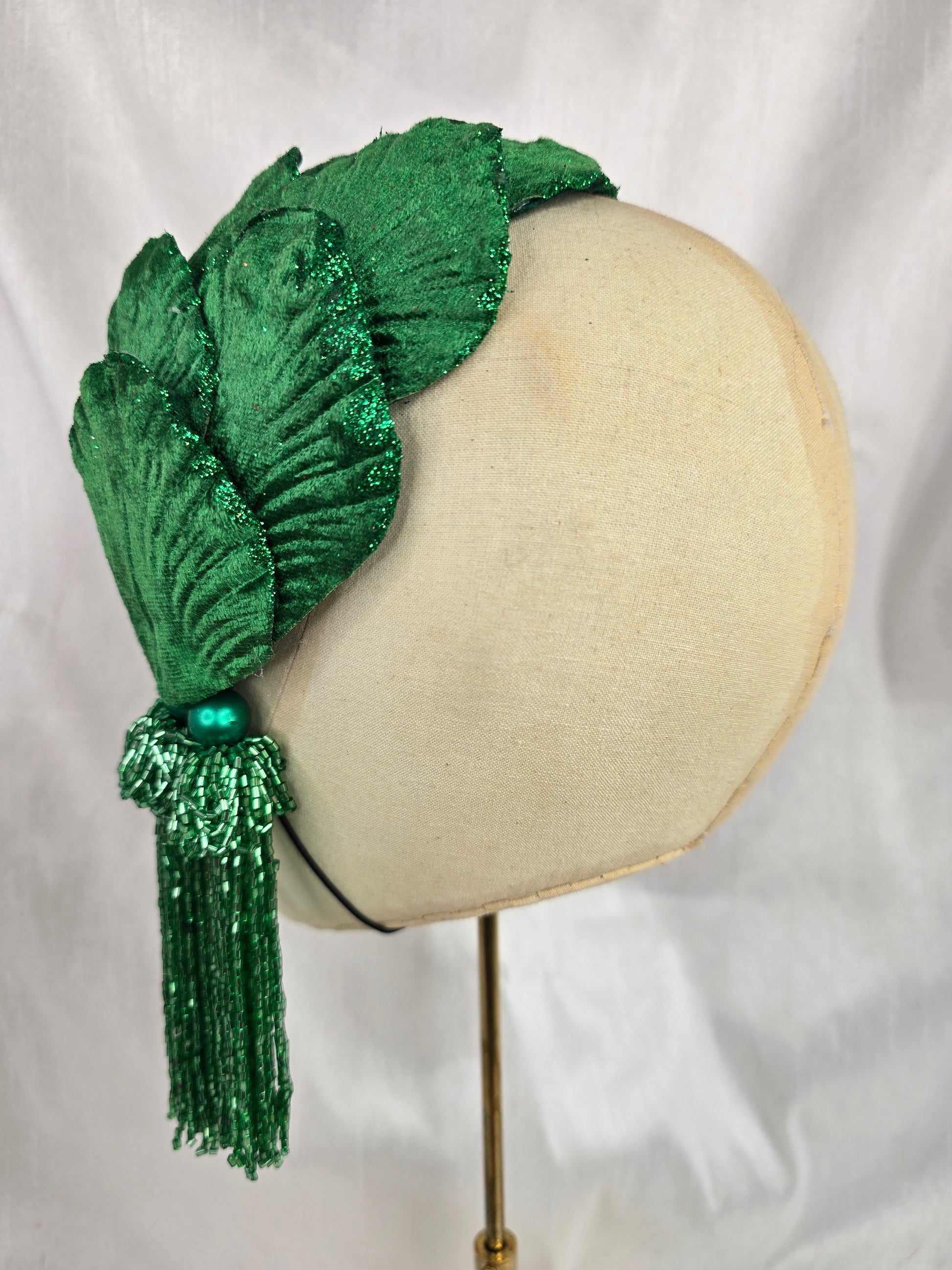 Beautiful Deco style emerald green half hat/fascinator with glitter. Adorned with 2 green glamorous beaded tassels.