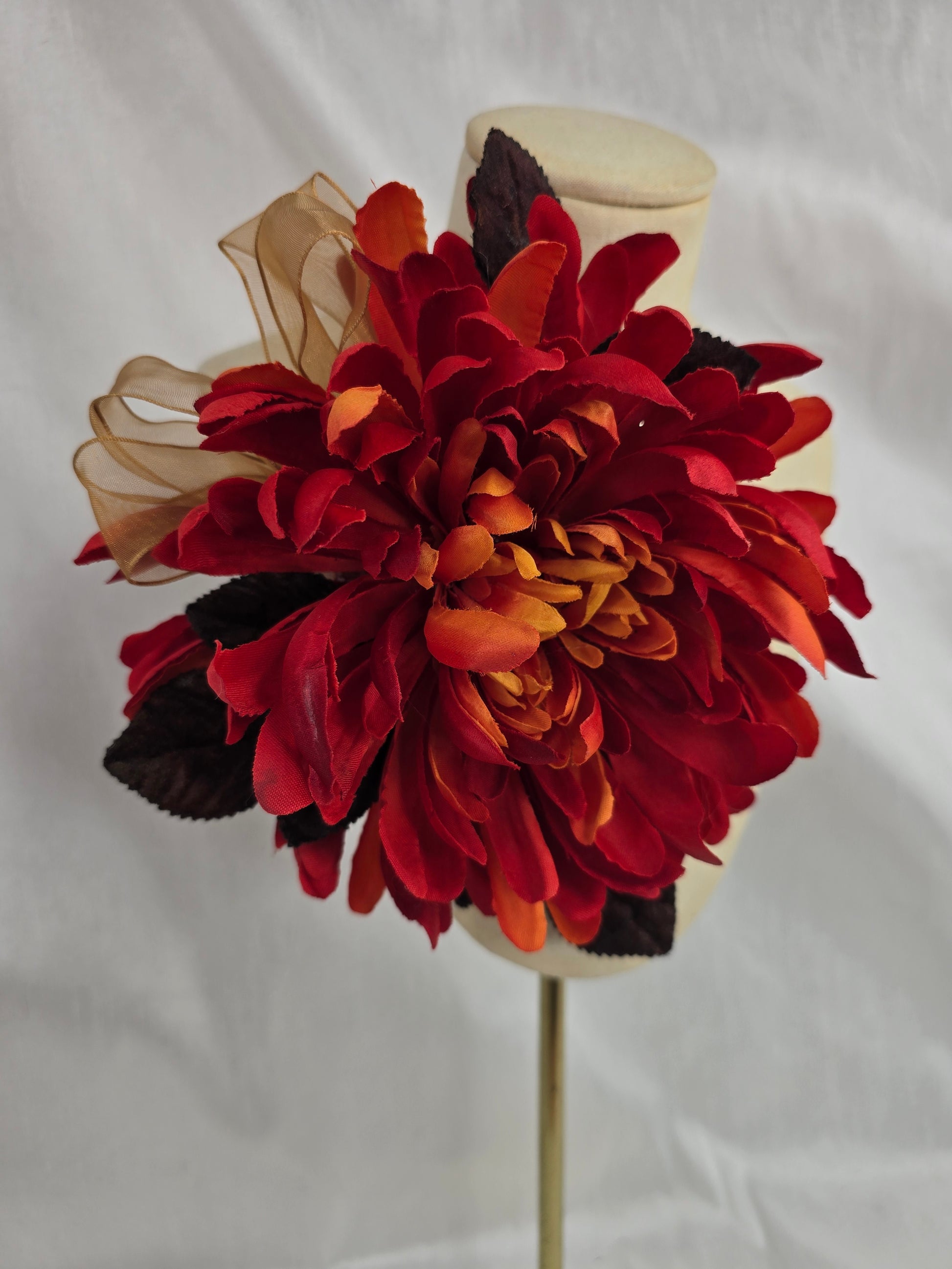 Large statement orange chrysanthemum corsage with chocolate brown velvet leaves. Finished off with a wired organza bow. Perfect for your autumnal suits and coats.