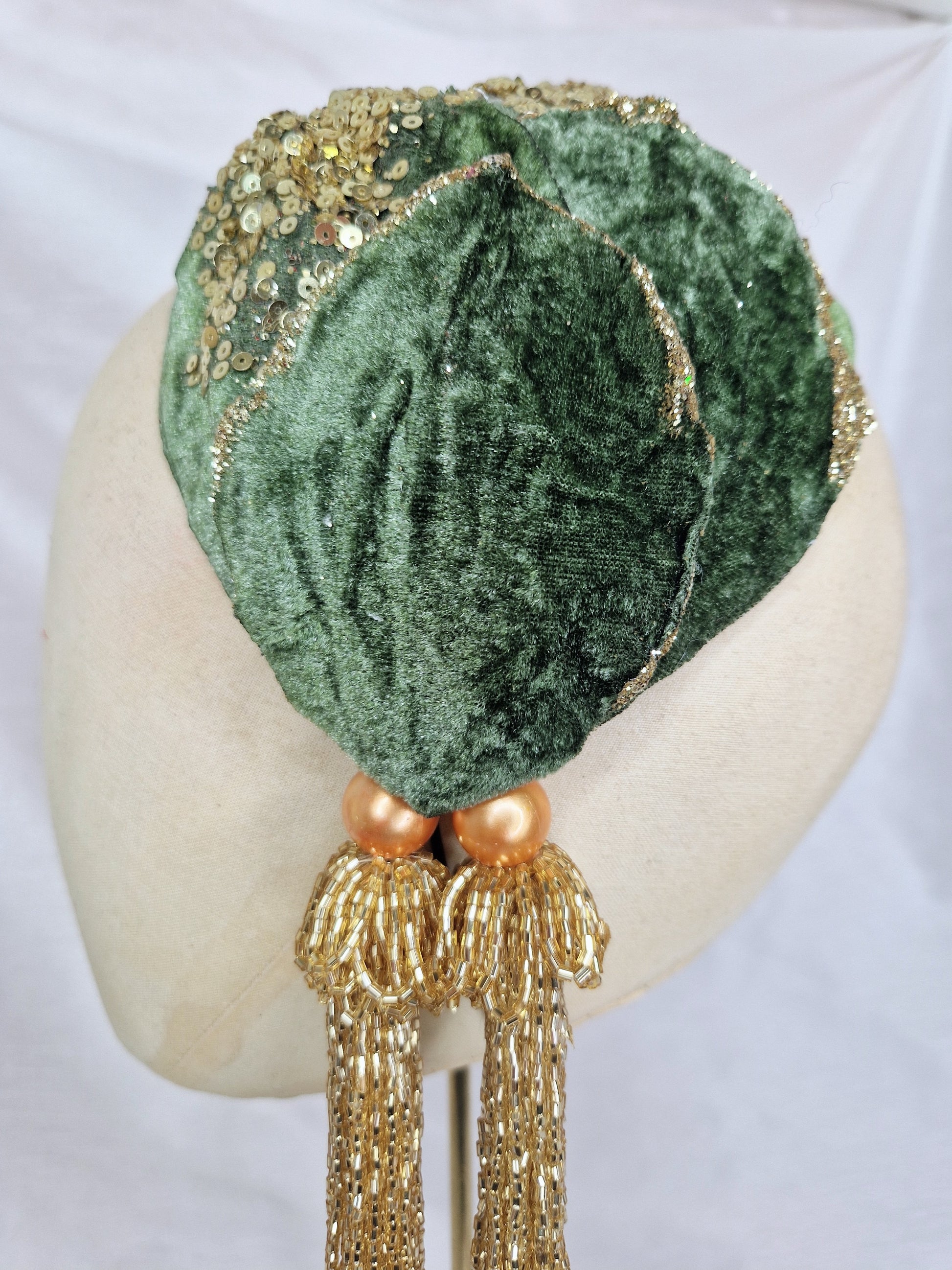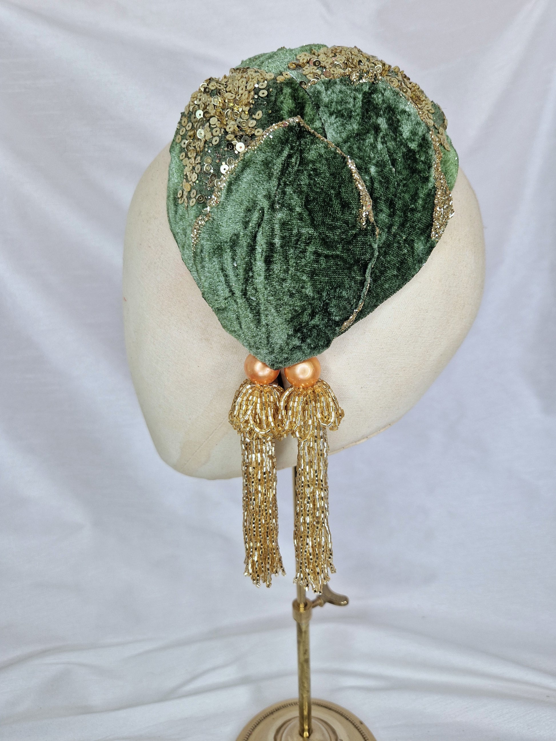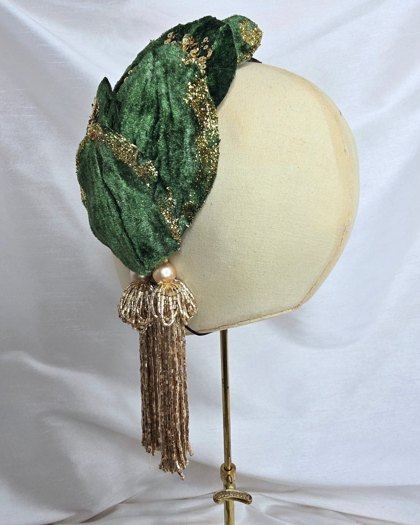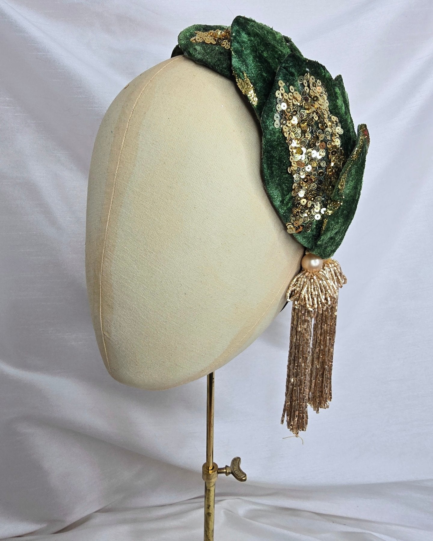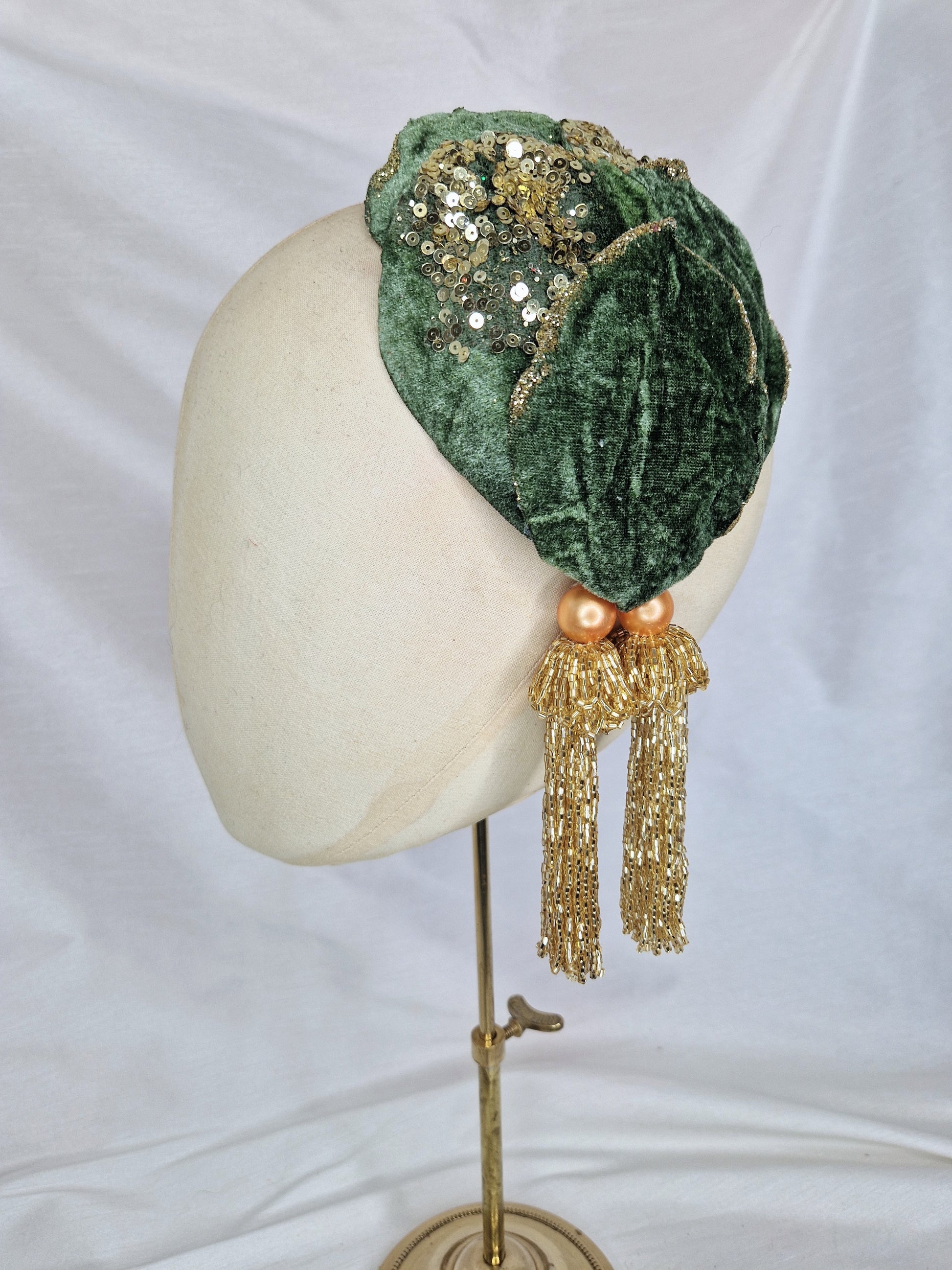 Beautiful Deco style olive green velvet half hat/fascinator with gold sequins. Adorned with 2 gold glamorous beaded tassels.