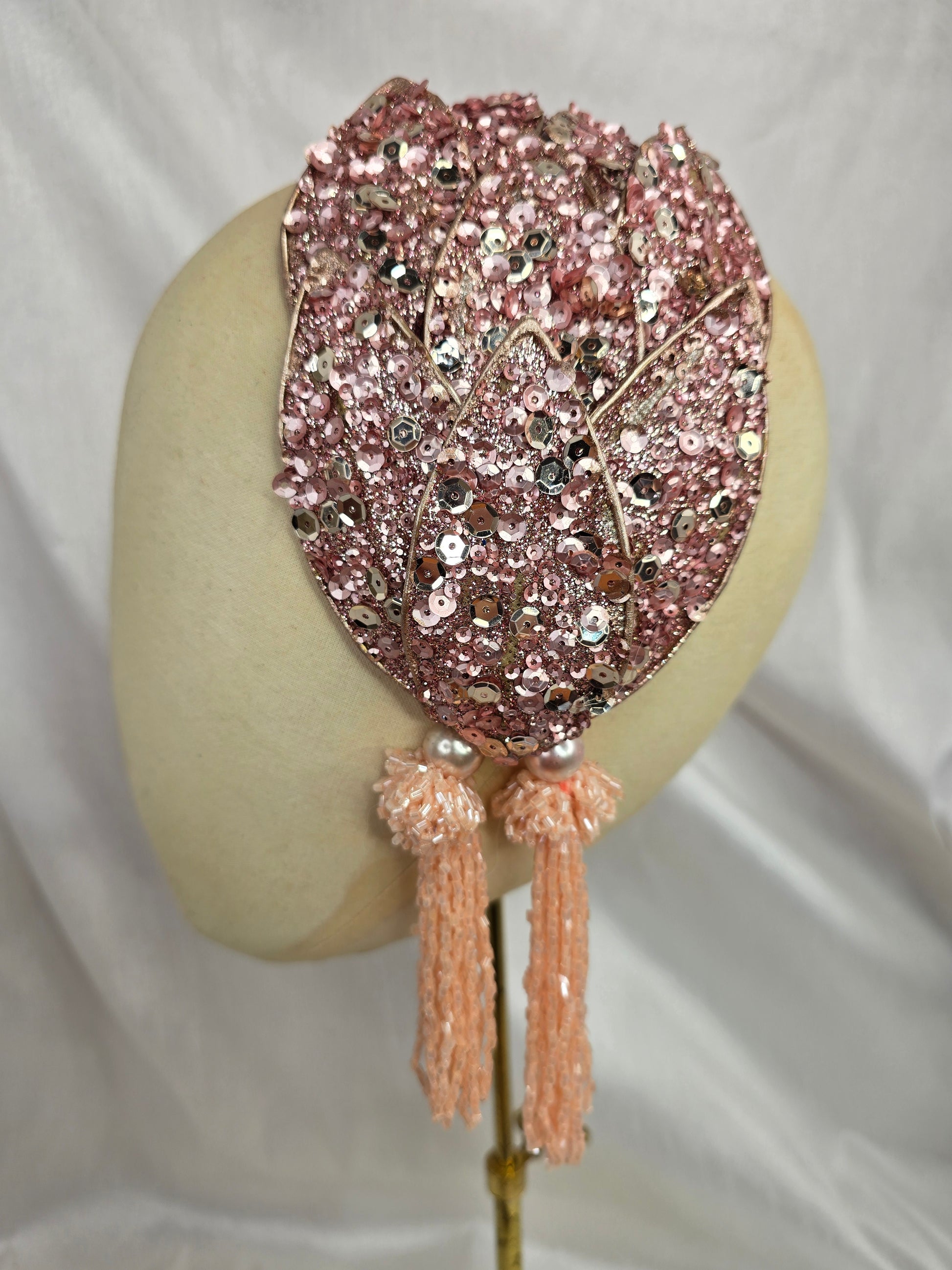 Beautiful Deco style pale pink half hat/fascinator with glitter. Adorned with 2 glamorous peachy pink beaded tassels.
