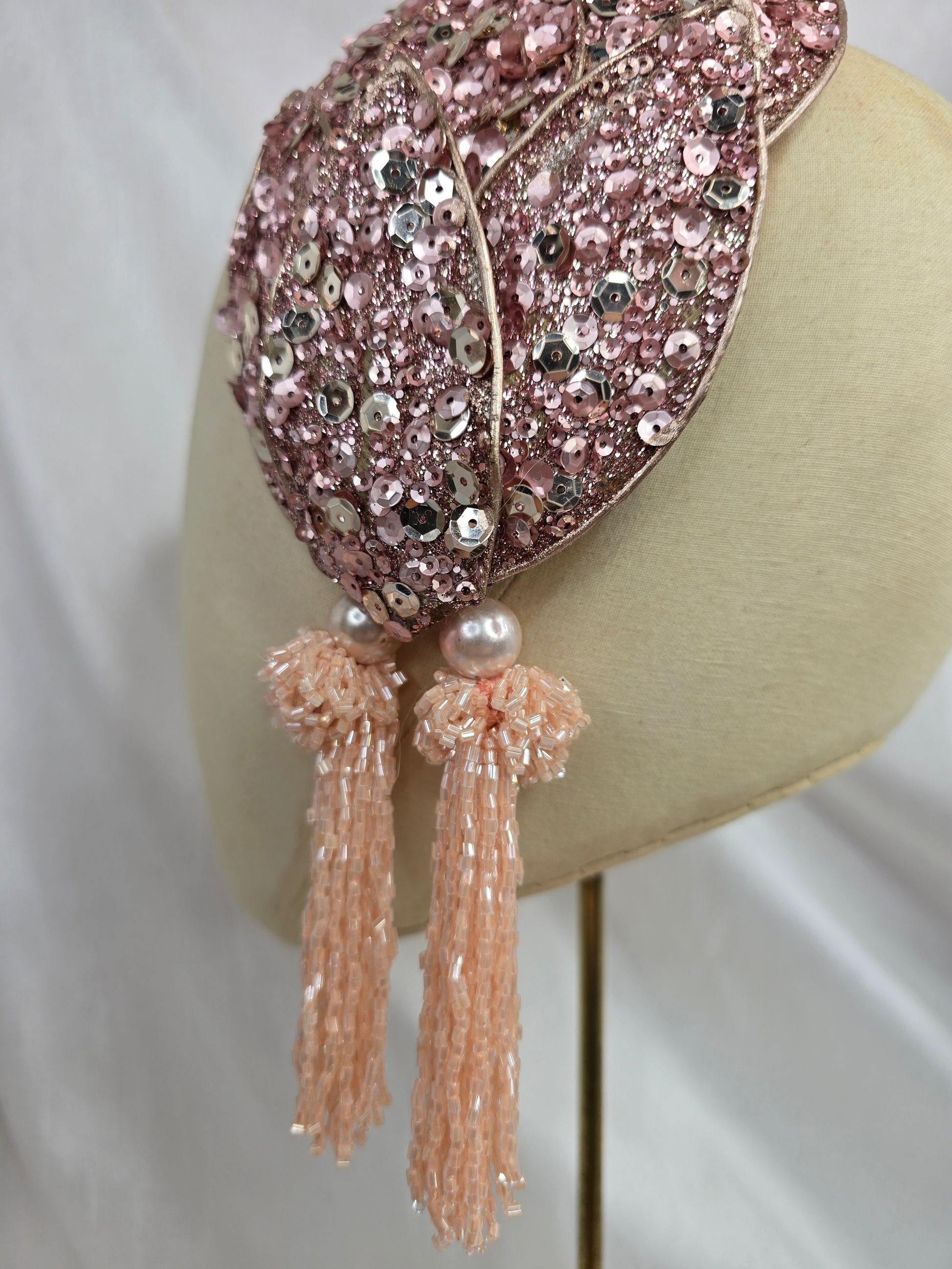 Pale pink sequin half hat/fascinator with beaded tassels (made to order)
