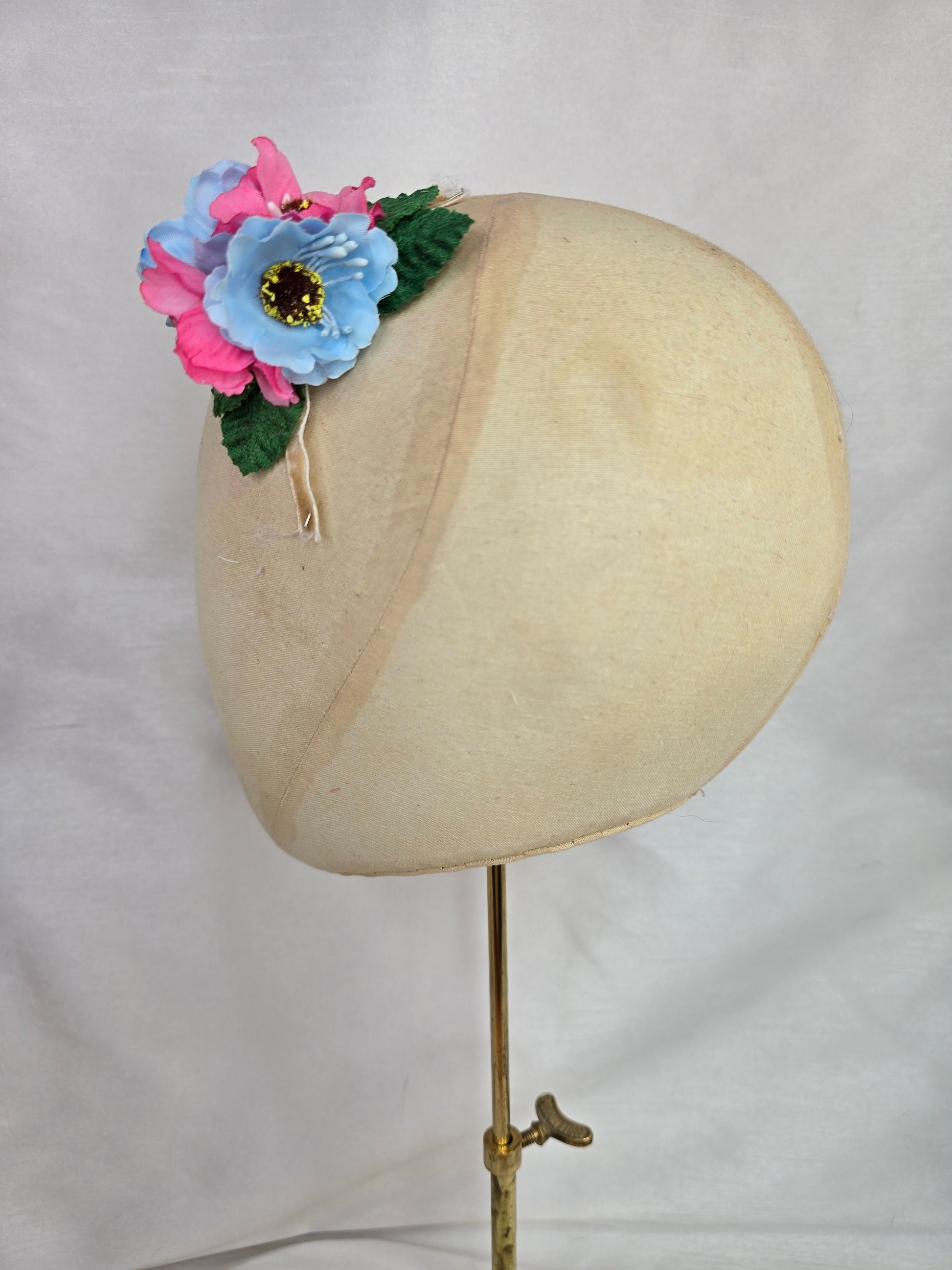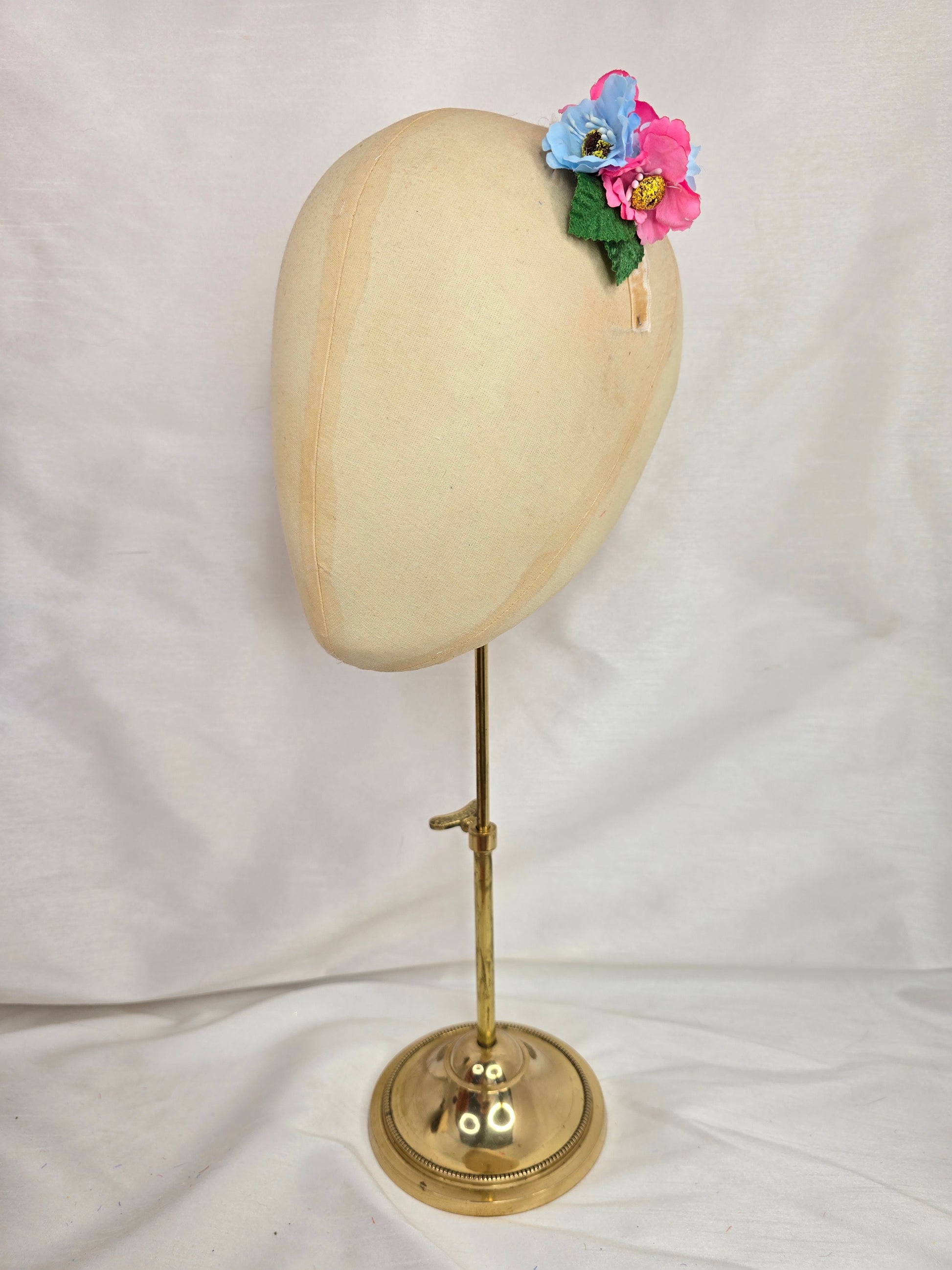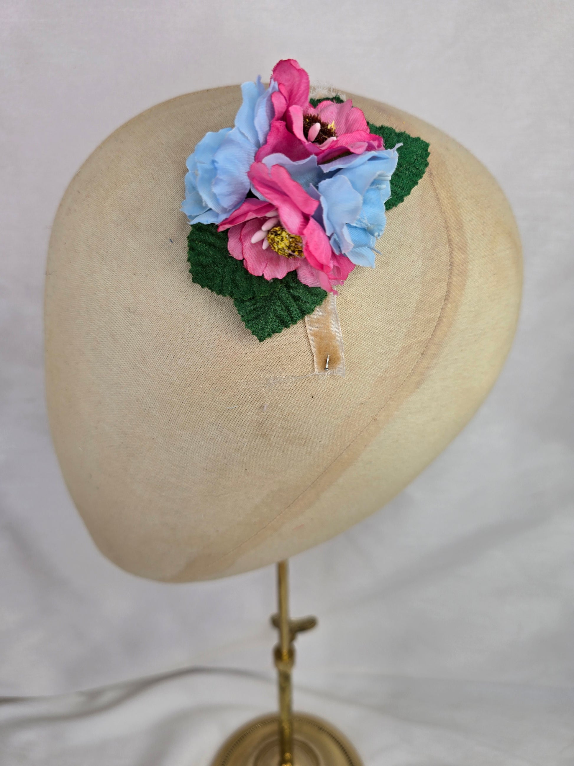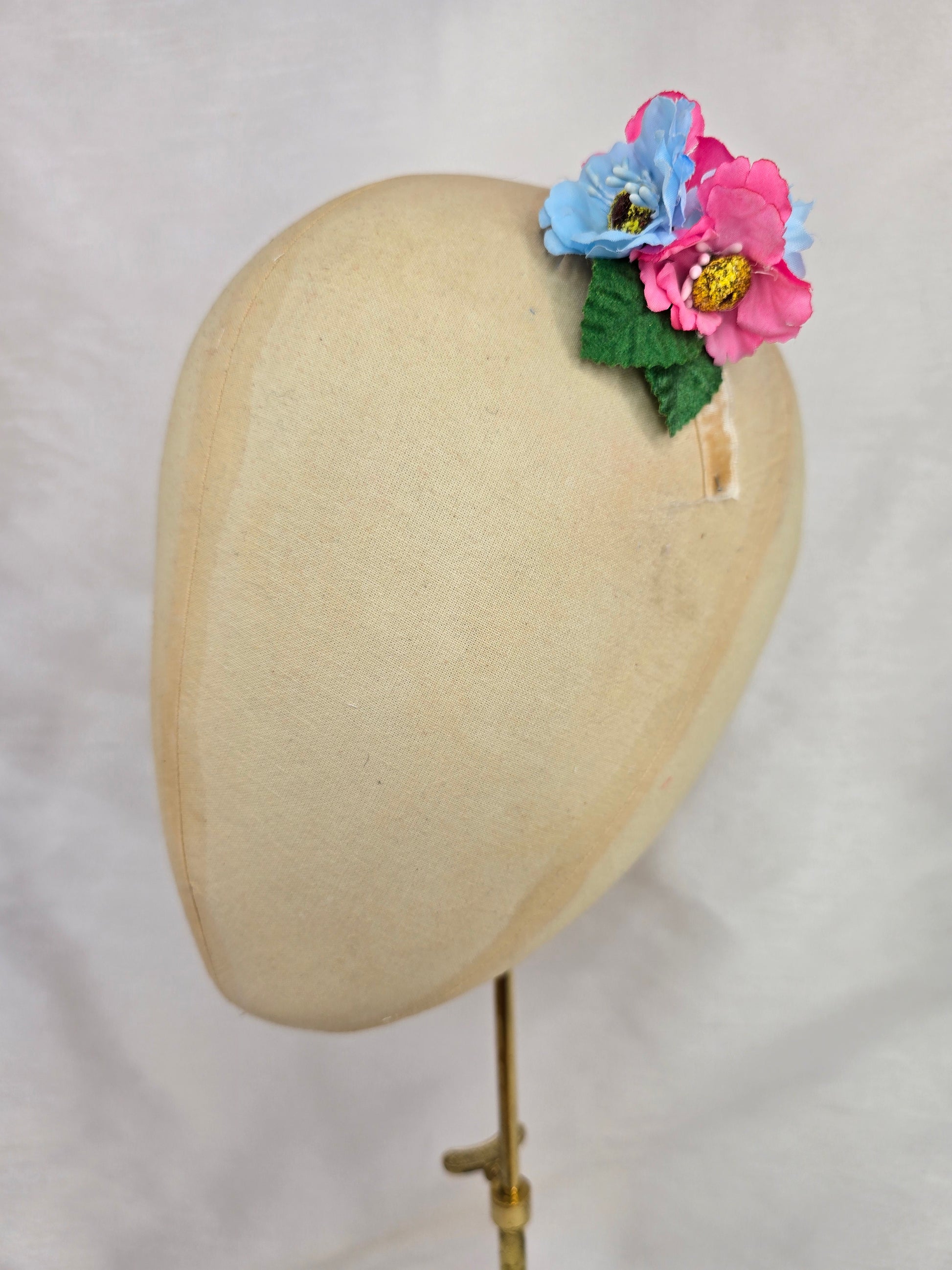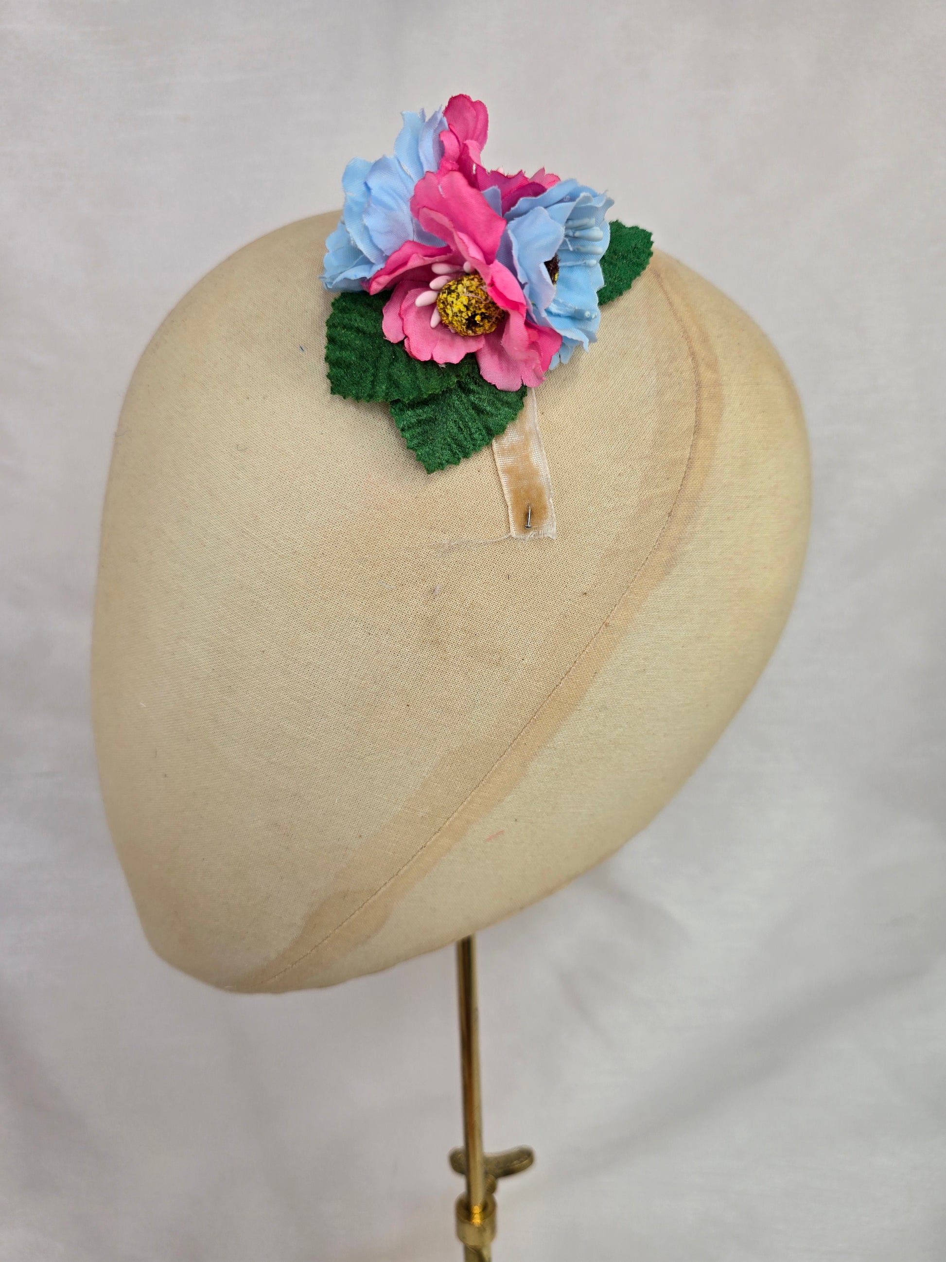 If you prefer your hair flowers small then this is for you. Yellow centred mini anemones in pale pink and pale blue sit on a bed of wired velvet leaves.