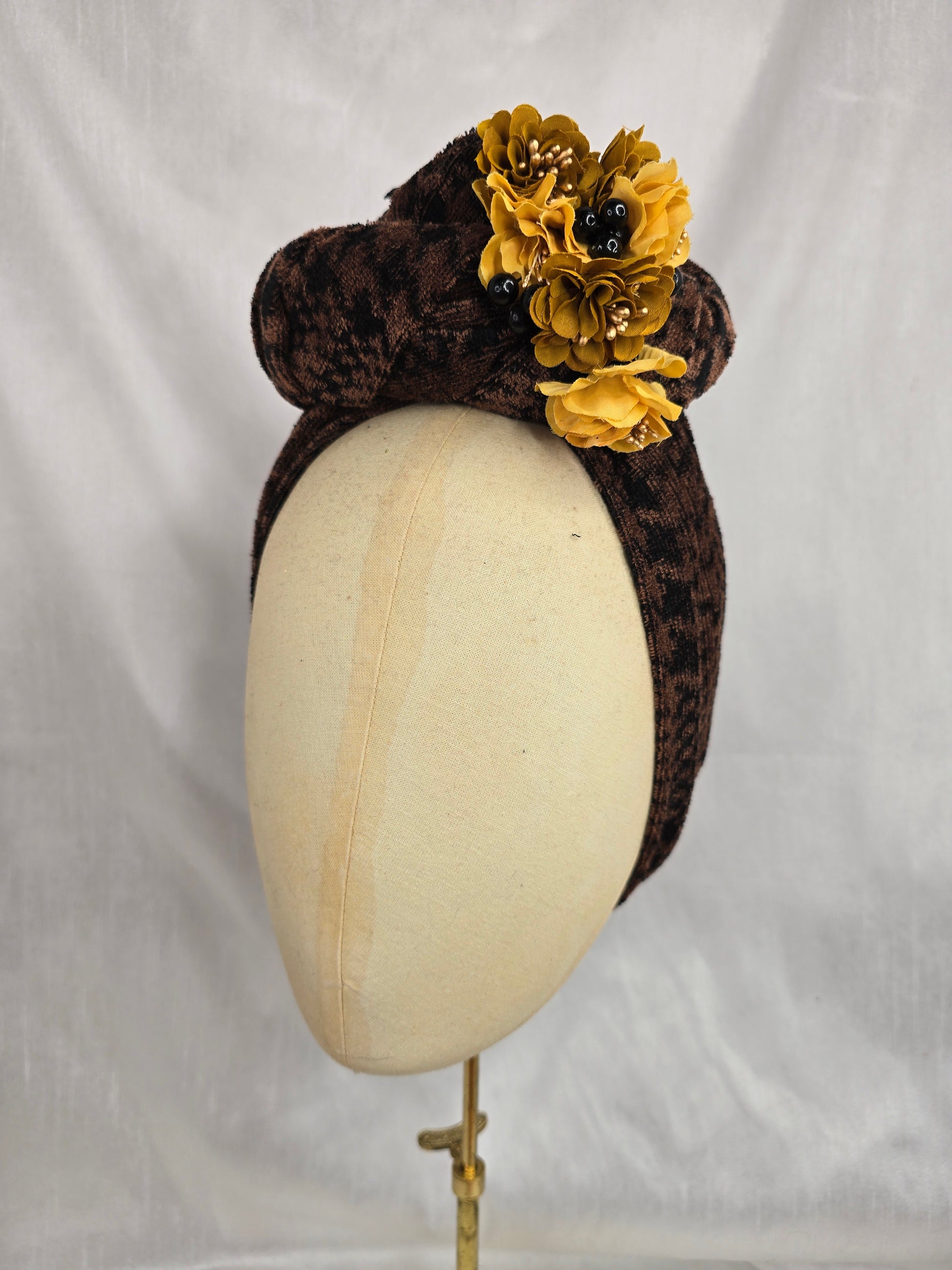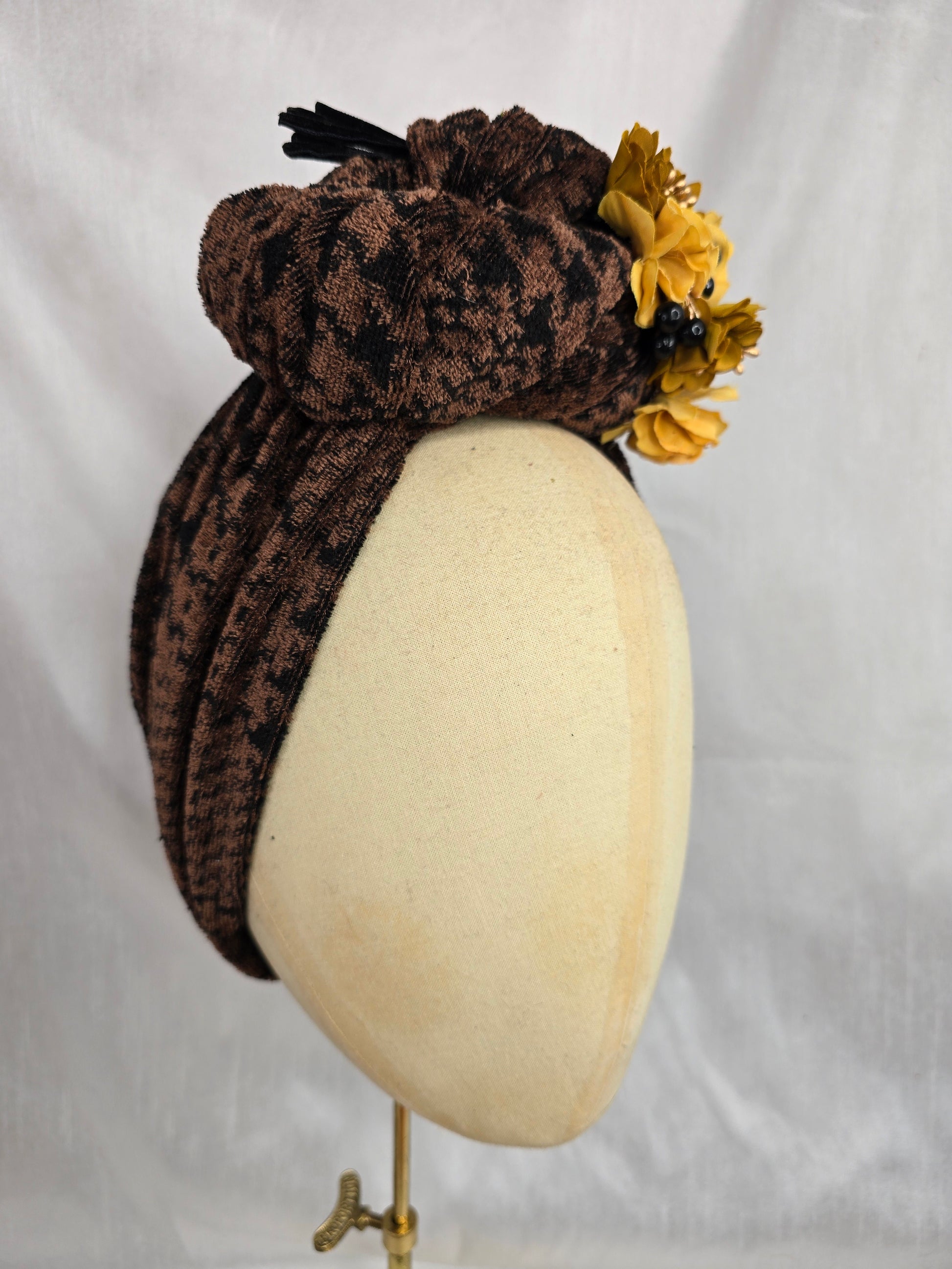 Brown houndstooth stretch velvet turban with mustard flowers