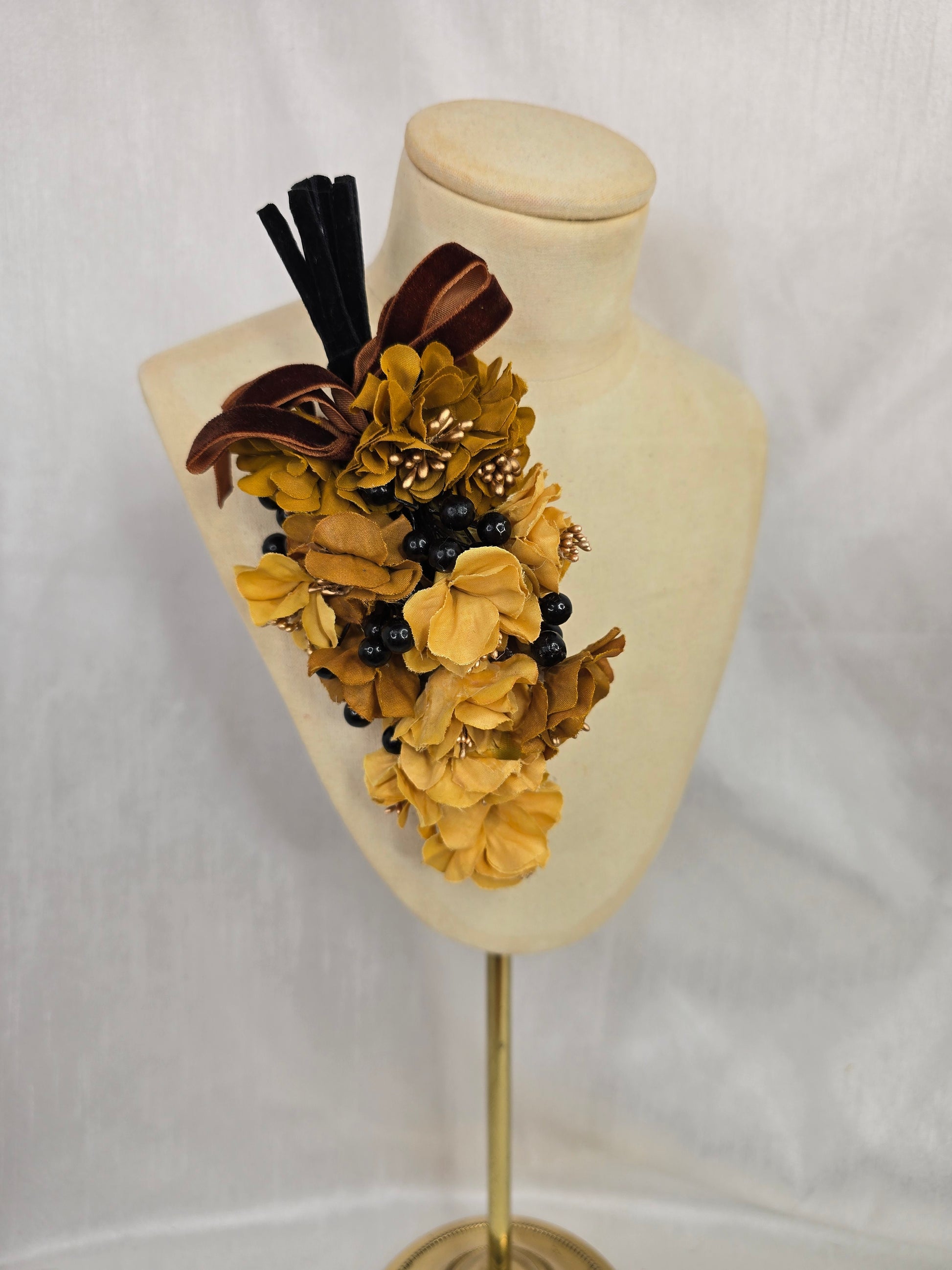 Black and warm brown houndstooth stretch turban with coordinating corsage, flower trim and hair flower. The flowers are created from mustard blossoms with gold stamens.